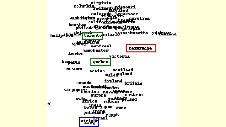 Displaying the learned feature vectors in a 2 -D map • We can get an idea of the quality of the learned feature vectors by displaying them in a 2 -D map. – Display very similar vectors very close to each other. – Use a multi-scale method called “t-sne” that also displays similar clusters near each other. • The learned feature vectors capture lots of subtle semantic distinctions, just by looking at strings of words. – No extra supervision is required. – The information is all in the contexts that the word is used in. – Consider “She scrommed him with the frying pan. ”