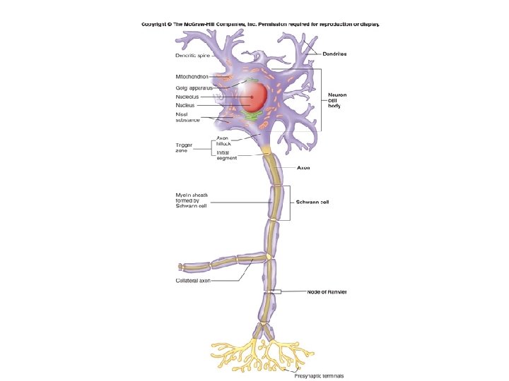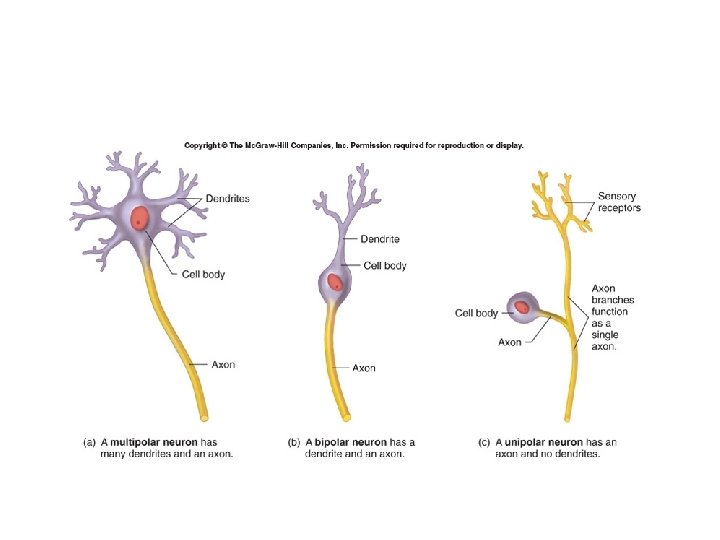 Types of neurons • Multipolar – Many dendrites – Single axon • Bipolar – Single dendrite – Single axon • Unipolar – No dendrite – Single axon