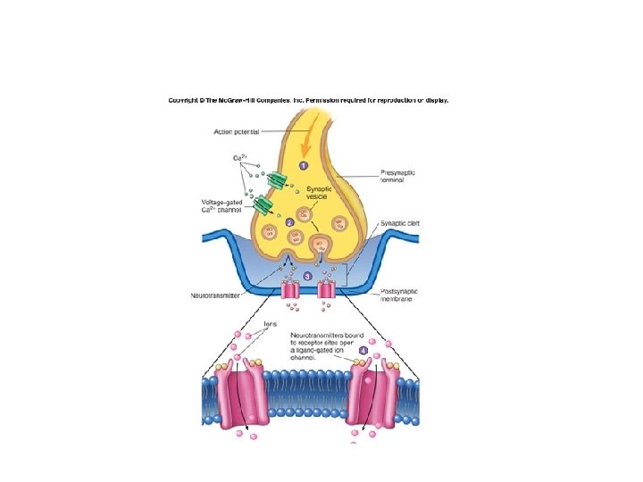• Neurotransmitter action – Specific receptor for the specific neurotransmitter – Response • Stimulatory (AP generation) • Inhibitory (hyperpolarization) • Depends on types of receptors present on the cell
