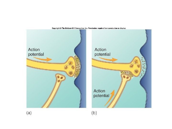 Excitatory vs. Inhibitory postsynaptic potential • Response of postsynaptic terminal to a neurotransmitter – Depolarization • Excitatory postsynaptic potential • Excitatory presynaptic neuron – Hyperpolarization • Inhibitory postsynaptic potential – Increased K or Cl permeability • Inhibitory presynaptic neuron