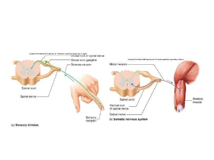 • Afferent and efferent nerves – Afferent/sensory • Transmission of signals from sensory receptors to the CNS • Entry route – Dorsal horn of the spinal cord – Efferent/motor • Transmission of information from the CNS to the organs – Motor neurons • Transmission routre – Ventral horn of the spinal cord
