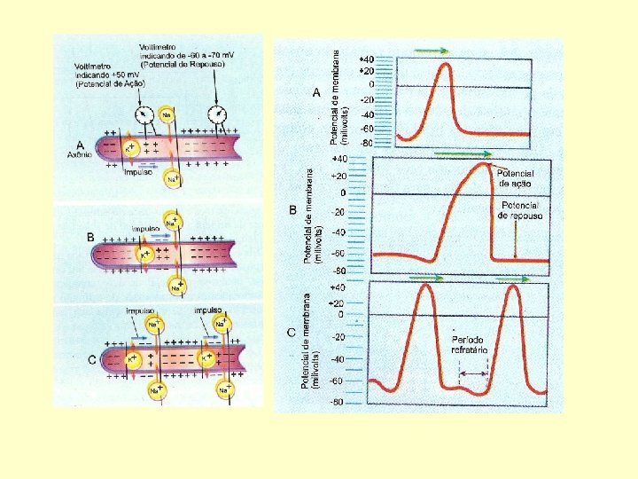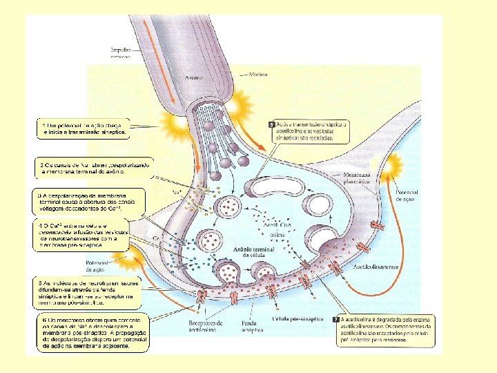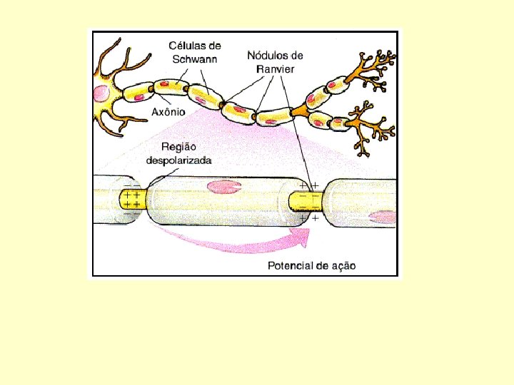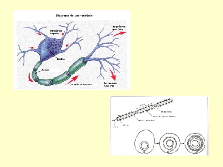 Tipos de Neurônios Sensoriais (sensitivos) ou aferentes Conduzem impulsos dos receptores de estímulos ambientais ou internos para o sistema nervoso central (cérebro, medula). Efetuadores, motores ou eferentes Conduzem impulsos do sistema nervoso central aos órgãos efetuadores de respostas, tais como músculos ou glândulas. Associativos (ou interneurônios) Estabelecem a ligação entre os dois tipos precedentes (não são obrigatórios; em certos casos a conexão é direta). Nervo Feixe de fibras nervosas (prolongamentos de neurônios, axônios, dendritos ou ambos), fora do encéfalo ou da medula espinhal. Gânglio Nervoso Dilatação que contém corpos celulares de neurônios, situada em um nervo, fora das partes centrais do sistema nervoso. Conjunto ou massa de células nervosas.