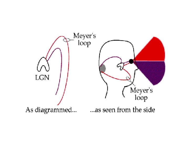 VISUAL PATHWAY only nasal fibres cross over = ‘decussation’ optic nerve chiasm optic tract ‘Meyer’s Loop’ lateral geniculate nucleus optic radiation primary visual cortex