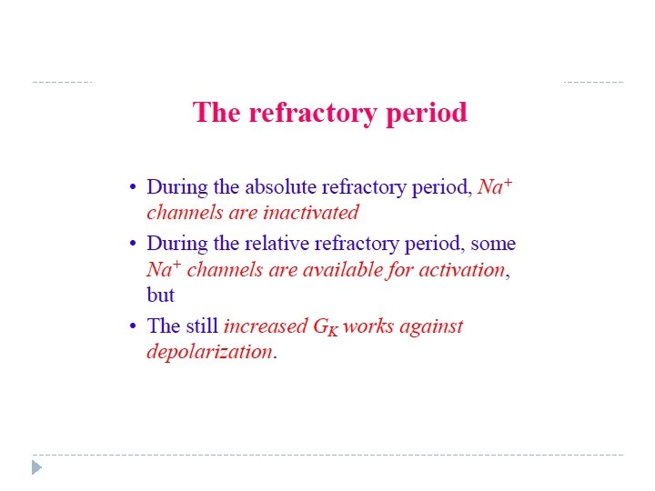 Properties of electrotonic potentials Graded response determined by the strength of the stimulus Depolarizing or hyperpolarizing direction Time course determined by the membrane time constant τ=R • C Response in elongated cells determined by the membrane length constant λ = rm / ri No refractory periods Passive, linear membrane behaviour, voltage dependent Na channels do not open
