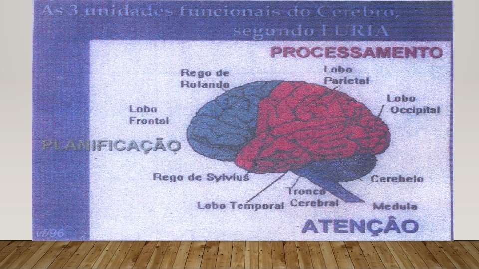 MODELO LURIANO DE CÉREBRO 1º Neurobloco Atenção Vigília 2ºNeurobloco Funções especificas Auditivas, visuais Tátil – cinestésicas Processa, Registro, Organização 3º Neurobloco Regulação de concentração Planificação Execução