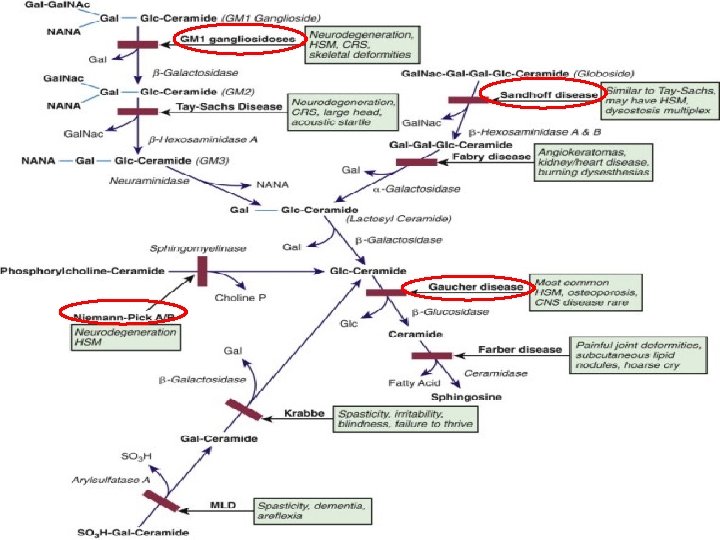 GM 1 Gangliosides Β- Galactosidese Globoside GM 1 Gangliosidoses Β- Hexoaminodase A/B Sandhoff GM 2 Ganglioside Β- Hexoaminodase A Tay-sachs Gal-Glc-Ceramide GM 3 Ganglioside α- Galactosidese Fabry (X linked) Gal-Glc-Ceramide Phoshoryl-choline ceramide Sphingomyelinase Β- Galactosidese Glc-Ceramide Neiman pick Β- Galactosidese Krabbe Gal-Ceramide Arylsulfatase H-Gal-Ceramide MLD Ceramidase Goucher Ceramide Farber Ceramidase sphingosine