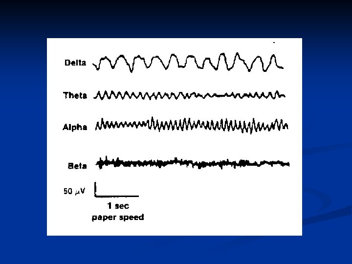 Introduction to EEG Interpretation Basic EEG Interpretation. You basically study an EEG for three things -- frequency, amplitude, and symmetry. 1. Frequency. The electrical waveform of the EEG is divided into sine waves of specific frequencies (cycles/sec or Hertz = Hz). The mnemonic I use to remember the frequencies is: DON'T TOUCH A BRAIN, or DON'T TOUCH A BAGEL – D. T. A. B. Delta waves = 0 to 3 Hz -- Deep Anesthesia or Deep "Stage 4" Sleep Theta waves = 4 to 7 Hz -- general anesthesia and hyperventilation Alpha waves = 8 to 13 Hz -- Awake but relaxed, eyes closed Beta waves = 14 to 30 Hz -- awake and alert (eyes open) or excitement phase of anesthesia