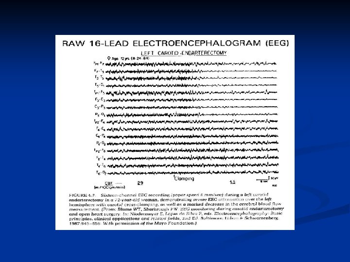 Decreased frequency, decreased amplitude Barbiturates (high dose) Hypoxia (mild) Hypercarbia (severe) Hypothermia (< 35 o. C) Electrical silence Barbiturates (coma dose) Etomidate, propofol (high dose) Isoflurane, desflurane, sevoflurane (2 MAC) Hypoxia (severe) Hypothermia (< 15 -20 o. C) Brain death