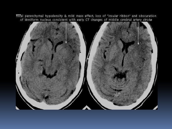 Acute Ischemic Stroke Acute Thrombolysis Balance restoration of blood flow and hemorrhage risk No evidence of hemorrhage on CT Hypodensity on CT < 1/3 of hemisphere Onset of symptoms within 3 hours of r. TPA use SBP < 185 DBP < 110 INR < 1. 7, Platelets > 100, 000, No ASA or anticoagulation, No trauma or recent surgery r. TPA: 0. 9 mg/kg IV over 60 minutes with 10% of dose given over the 1 st minute