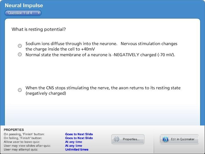 The movement of a neural impulse. Based around the movement of ions; potassium (K+), sodium (Na+). Resting potential - In its normal state the membrane of a neurone is – NEGATIVELY charged (-70 m. V). Action potential - Sodium ions diffuse through into the neurone. - Nervous stimulation changes the charge inside the cell to +40 m. V Repolarisation - When the CNS stops stimulating the nerve, the axon returns to its resting state (negatively charged)