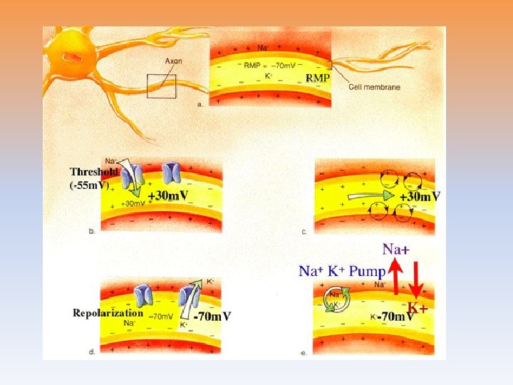 Action Potential a) Resting membrane potential (RMP) at -70 m. V. Na+ on outside and K+ on inside of cell b) As depolarization reaches threshold of -55 m. V, the action potential is triggered and Na+ rushes into cell. Membrane potential reaches +30 m. V on action potential c) Propagation of the action potential at 100 m/sec (which is 225 mph). Membrane potential at +30 m. V d) Repolarization occurs with K+ exiting the cell to return to -70 m. V RMP e) Return of ions (Na+ and K+) to their extracellular and intracellular sites by the sodium potassium (Na+K+) pump