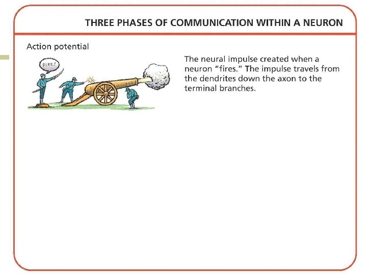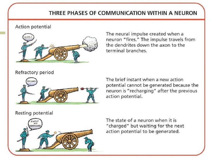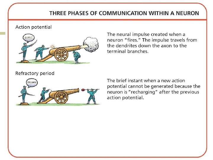 Refractory Period n n The “recharging phase” when a neuron, after firing, cannot generate another action potential Once the refractory period is complete the neuron can fire again