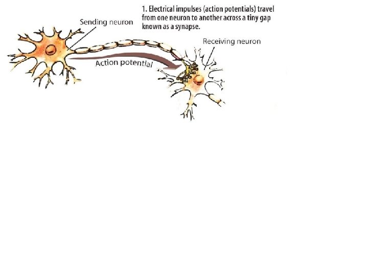 Synapse n n n The tiny, fluid filled gap between the axon tip of the sending neuron and the dendrite or cell body of the receiving neuron Tiny gap at this junction is called the synaptic gap or cleft The action potential cannot jump the gap