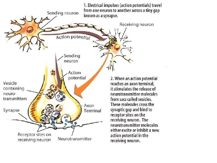 Neurotransmitters n n n Chemical messengers that traverse the synaptic gap between neurons Released by sending neuron, bind to receptor sites on the receiving neuron Influence whether the second neuron will generate an action potential or not
