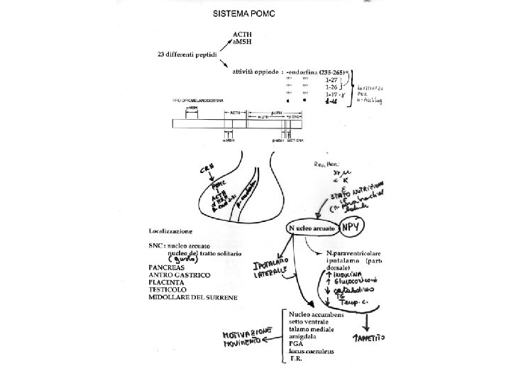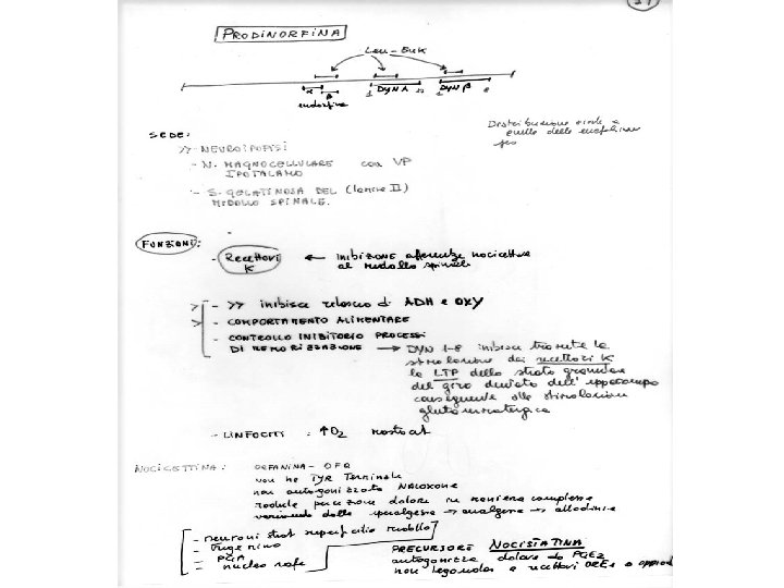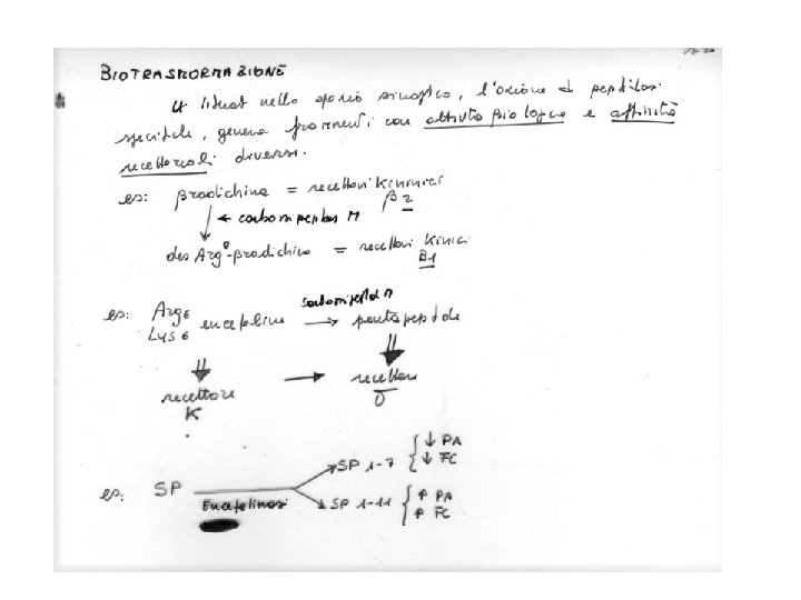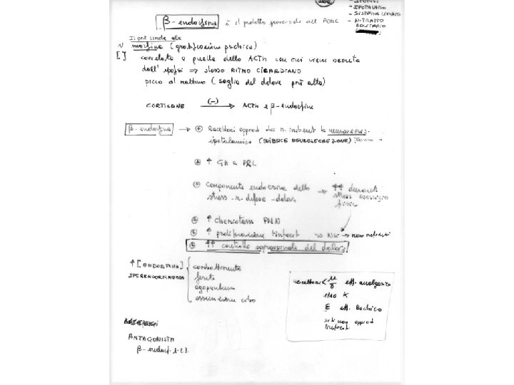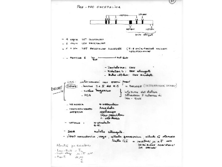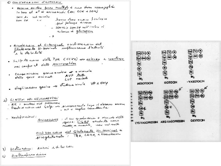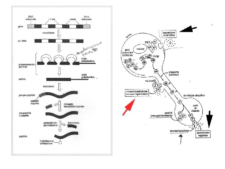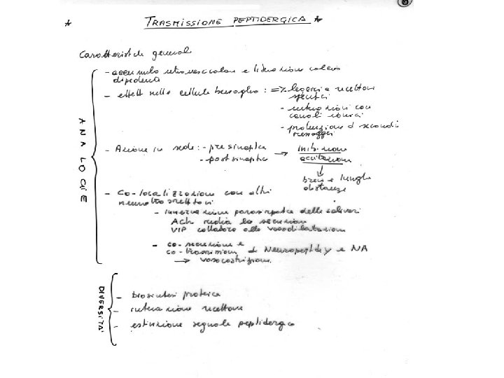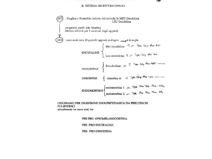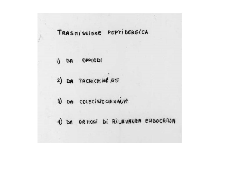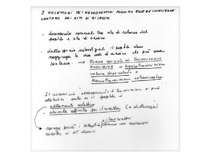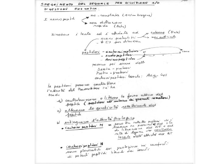 NEUROTRASMETTITORI DI TERZO TIPO 1) PEPTIDI DI 3 -100 RESIDUI 2) CONCENTRAZIONI: fentomoli, picomoli/gr tessuto 3) PRECURSORE: è una molecola più grande sintetizzata nel corpo cellulare a partire da un m. RNA 4) NO Re-Uptake 5) “ COTRASMETTITORI”, spesso associati a NT di I e II tipo 6) “NEURO-ORMONI” perché agiscono anche a distanza dal sito di rilascio
