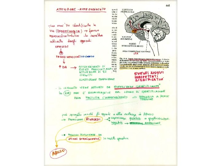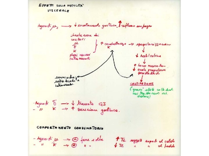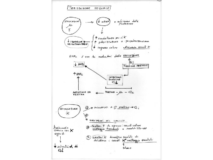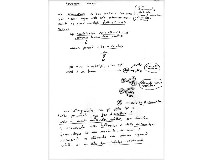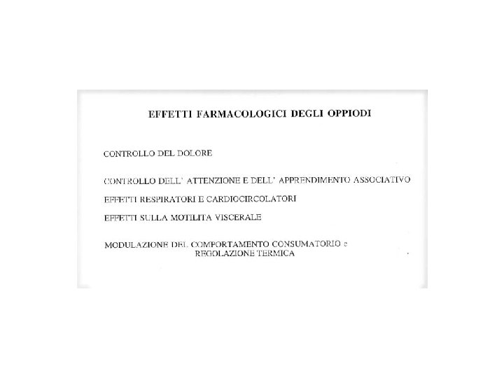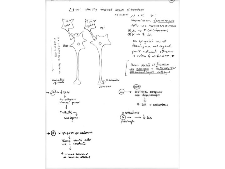 CANNABINOIDI Marijuana (cannabis sativa) e Hashish (resina estratta, usati da secoli D 9 -tetraidrocannabinolo (isolato nel 1964), preparazione farmaceutica approvata dalla Food and Drug Administration Disponibilità di agonisti cannabinoidi ha permesso di identificare, isolare e clonare i recettori specifici di queste sostanze, presenti sia nel SNP e SNC Recettore CB 1 e CB 2, accoppiati a G-protein Recettore CB 1 >> SNC e SNP Ippocampo, regioni corticali associative, cervelletto, gangli base ( memoria e controllo movimenti). Assente nel talamo, mesencefalo e midollo allungato cio spiega la mamncanza di gravi effetti collaterali associati all’abuso di hashish Recettori CB 2 >> nel sistema immune Omologia 40% con CB 1