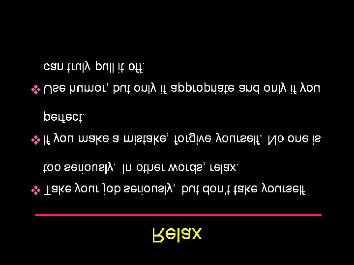 Relax v Take your job seriously, but don’t take yourself too seriously. In other words, relax. v If you make a mistake, forgive yourself. No one is perfect. v Use humor, but only if appropriate and only if you can truly pull it off.