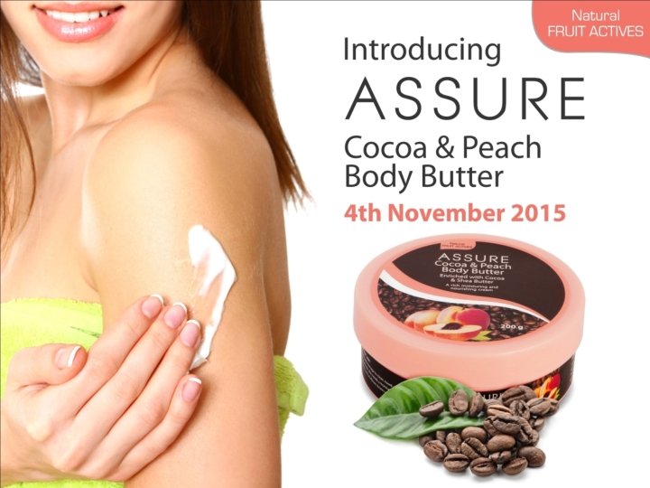 Assure Cocoa and Peach Body Butter Enriched with Cocoa and Shea Butter Why do we need to use a Body Butter? • There are many areas in our body that remain extremely dry at all times – like elbows, knees, neck area, cuticles of hands and feet and others • These areas need a moisture boost of rich moisturising agents like body butters • Body Butter is a unique combination of rich moisturising butters and essential oils that deeply hydrates the skin for long time The Product Rich butter cream whipped to provide lighter and easier application, melts into the skin providing long lasting moisturisation without leaving greasy residue.