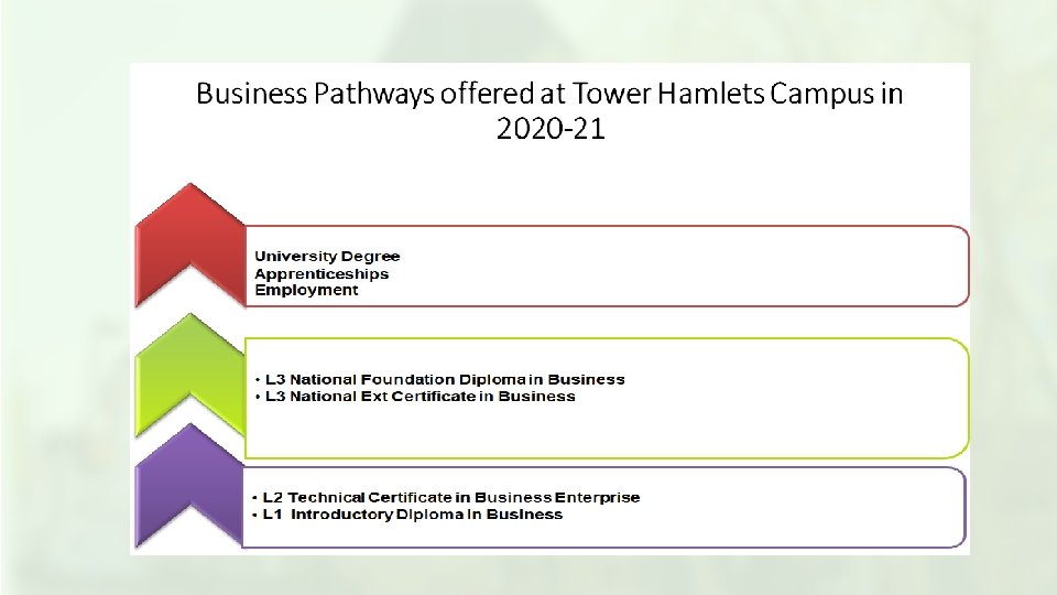 Business Courses Academic Courses are: • Level 3 National Foundation/ Extended Diploma in Business • Level 3 National Ext Certificate/ Diploma in Business • Access to HE Diploma in Business • Level 2 Technical Certificate in Business Enterprise • Level Introductory Diploma in Business • Professional Courses are: • AAT L 1 – Award in Accounting • AAT L 2 – Foundation Certificate in Accounting