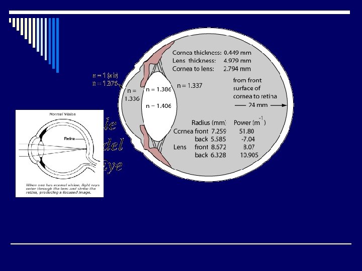 Effective eye model (Lin, 2005) S X L P 2 P 1 CORNEA LENS L = S + X + a. T 2 De = z [ P 3 – P 1/z – P 2 ] z = (1 - S/f) = 1 - S P 1/1336 = 0. 8 to 0. 85