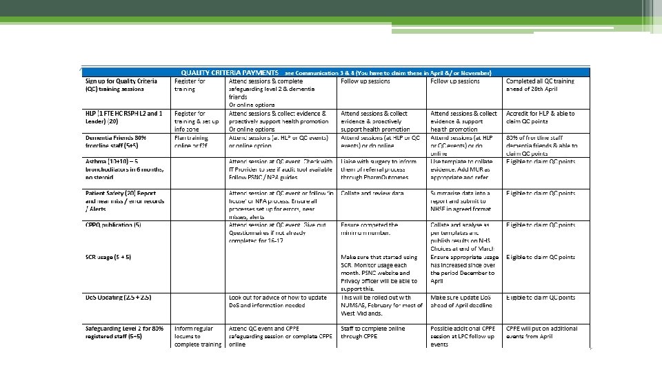Quality Payments in 17/18 • Total of 100 points • £ 64 per point • = £ 6, 400 per contract • Could increase as additional allocation if less than 100% uptake • To a max of £ 128 per point Gateway ▫ EPS is active and used ▫ NHS Choices is up to date and maintained (7 th Feb onwards) ▫ Active NHS Mail address and active (apply during January for generic email) ▫ Delivery of at least ONE specified Advanced service