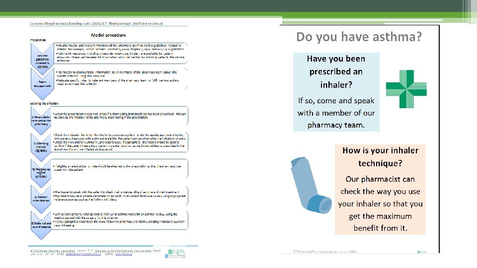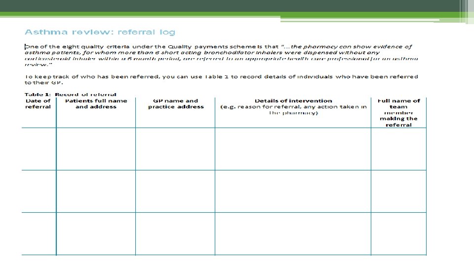 Asthma – clinical effectiveness quality payment • Community pharmacy contractors passing the gateway criteria will receive a Quality Payment if they meet one or more of the Quality Payment criteria. One of these is: • ‘On the day of the review, the pharmacy can show evidence of asthma patients, for whom more than 6 short acting bronchodilator inhalers were dispensed without any corticosteroid inhaler within a 6 month period, are referred to an appropriate health care professional for an asthma review. ’ • Two opportunities to collect 10 points (each worth £ 64)