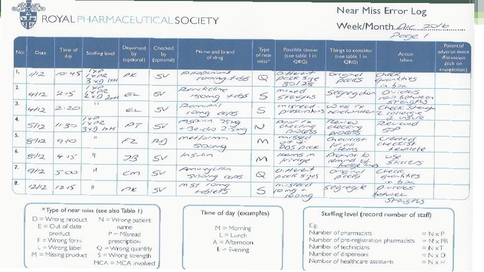 Near miss log Improvement Tool • Templates available from RPS website • To be used when reviewing the near miss log • Tool allows you to work out your near miss error percentage (calculated using your total items dispensed) • Review lets you understand ▫ ▫ What type of near misses occurred Why did they happen What needs to happen to minimise the risk of it happening again Review the actions within an agreed timescale to ensure action has been met • Complete as a team…not the pharmacist stuck in an office!!! • Does not have to be a drawn out process. If done weekly/monthly should not take > 30 - 60 mins • The more reviews you do…the easier they become…. and if the actions you put in place are correct, the error percentage will start to reduce