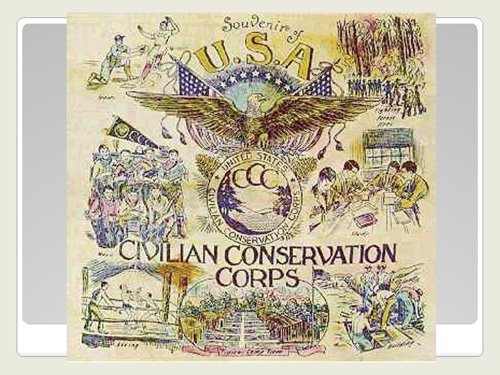 1 st New Deal �Focus on recovery and relief (First Hundred Days) �Created alphabet agencies �AAA-reset farm prices on goods such as corn and wheat �CCC- Civilian Conservation Corps- public work relief program focusing on work related to conserving and developing natural resources (flood control, dams, soil erosion projects)