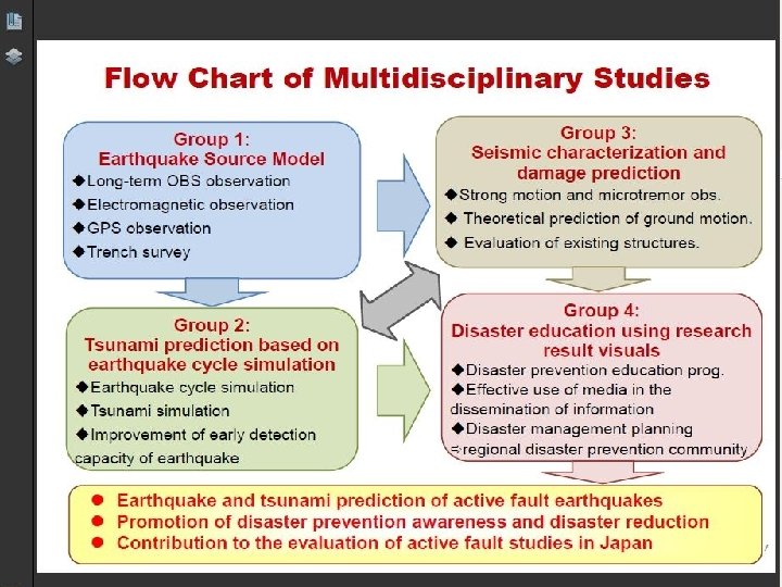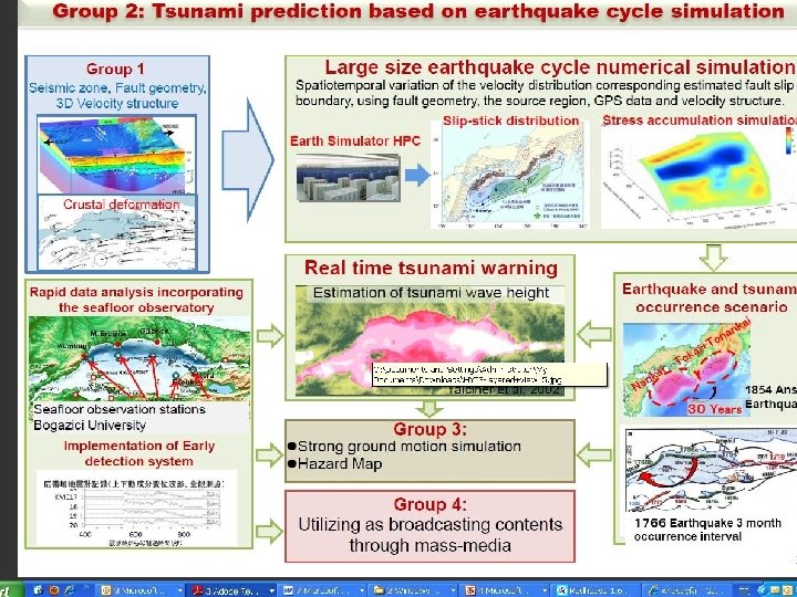 JICA-JST Project (Japan-Turkey) Theme 1: Seafloor Observations for Earthquake Source Models in the Marmara Sea Region Subgroup 1. 1: Long-term sea-bottom seismic observation 1. 1. a Micro-Earthquake activity 1. 1. b Stress field evaluation 1. 1. c Seismic tomography Subgroup 1. 2: Electromagnetic observation Subgroup 1. 3: GPS-acoustic observation Subgroup 1. 4: Geo chemical studies (water chemistry, radon, temperature, gas exhalations, current etc. Theme 2: Estimation of Strong Ground Motion for Earthquake Source Models Subgroup 2. 1: Micro-tremor observation and subsoil structure Subgroup 2. 2: Observation of strong ground motion Subgroup 2. 3: Theoretical estimation of ground motion Theme 3: Experimental Study of Building Response to Strong Ground Motion Theme 4: Forecasts of Earthquake and Tsunami Occurrences in the Marmara Sea Region Subgroup 4. 1: Incorporation of seafloor seismic data into Earthquake Early Warning (EEW) Subgroup 4. 2: Simulation of large earthquake occurrence along the North Anatolian Fault beneath the Marmara Sea and estimation of possible rupture parameters Subgroup 4. 3: Tsunami simulations and hazard assessment. Subgroup 4. 4: Tsunami monitoring Theme 5: Understanding of historical large earthquakes at on-land branches of the western part of the North Anatolian Fault Subgroup 5. 1: Trenching studies Subgroup 5. 2: In. SAR studies Theme 6: Effective Dissemination of Earthquake Hazard Information Subgroup 6. 1: Earthquake monitoring in the Yalova-Izmit-Bursa-Sakarya area Subgroup 6. 2: Rapid information with collaboration of mass-media Subgroup 6. 3: Hazard and risk assessment with collaboration of administration Subgroup 6. 4: Disaster Education Program