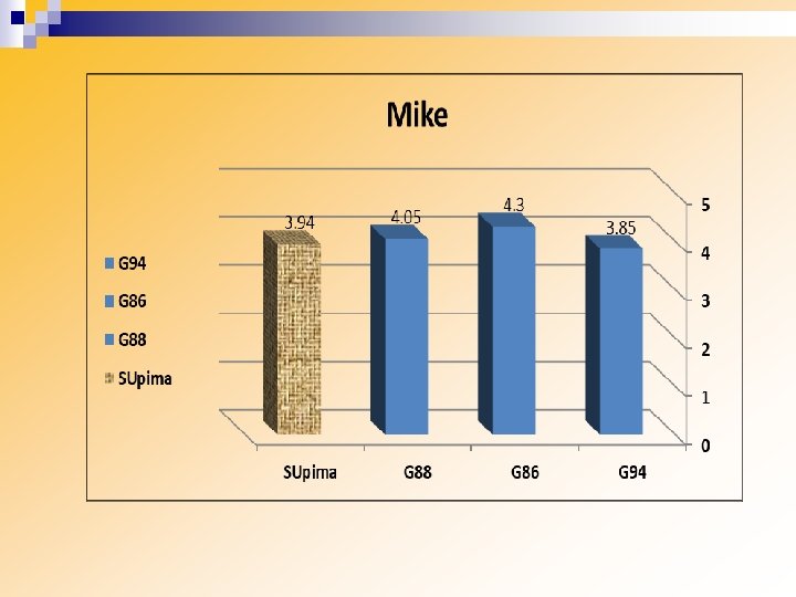 conclusion n Giza 94 and Giza 86 were found to be generally better to Supima in single yarn strength, yarn unevenness, yarn neps and hairiness. However, as fineness is required and preferred by luxury mills, Giza 94 could be regarded as comparable to Supima, although the price of Giza 94 and Giza 86 is less than Supima by 15%.