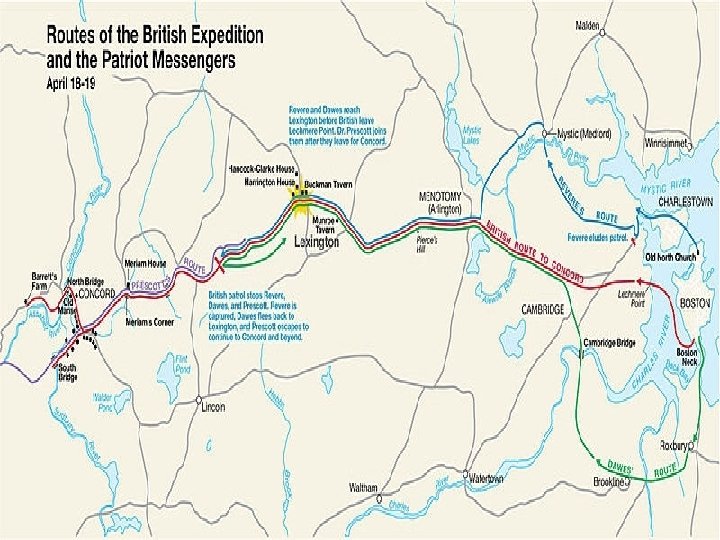 So u say u want a revolution? • British send soldiers into the country to “collect” colonial radicals. • British arrive in Lexington Massachusetts, shots are fired and Americans are killed • Concord—Americans retreat to Concord • British forced to march back to Boston in a disciplined straight line.