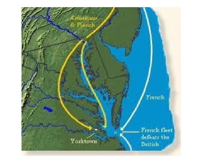 The end is near……Battle of Yorktown (Chesapeake Bay, VA) • October 1781 • Of the 7000 troops that fought the British and were led by George Washington, 5000 were French. • French Navy is the key in a successful blockade • On October 19, 1781 the British General, Charles Cornwallis surrenders!