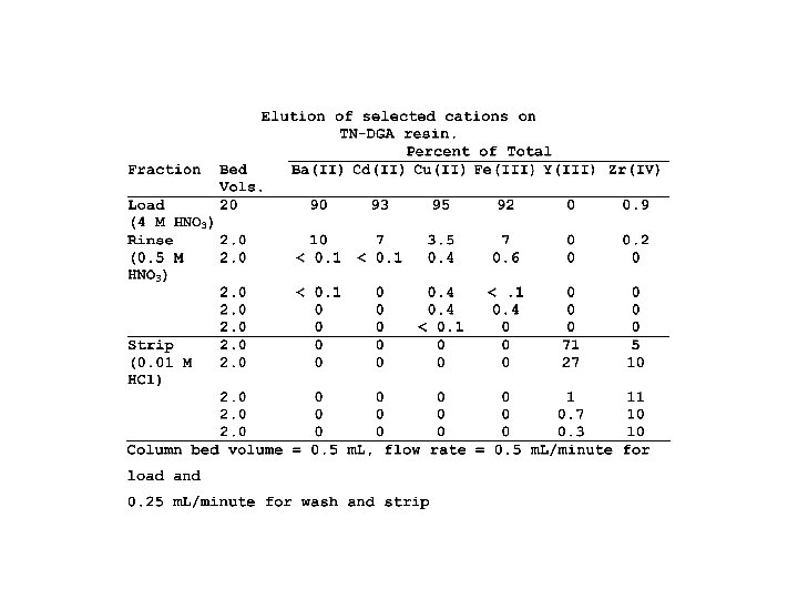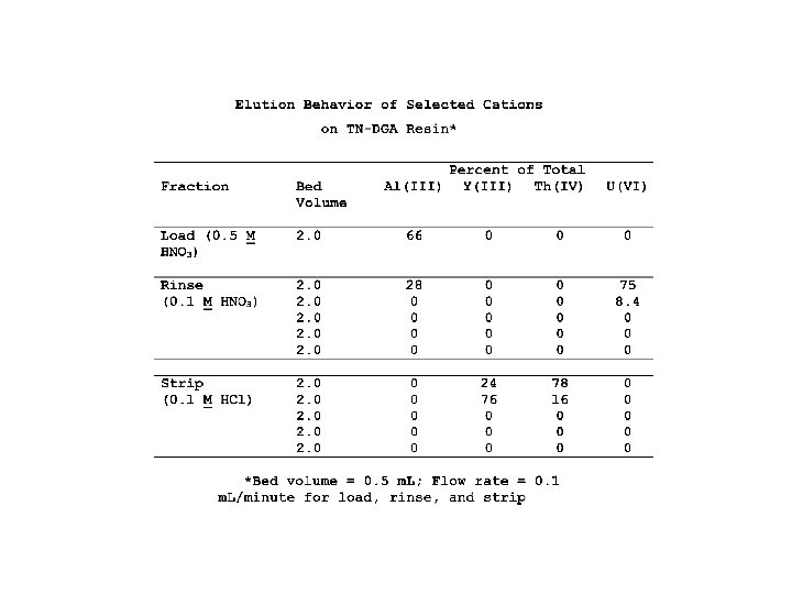 Characteristics of the UTEVA-2 Extraction Chromatographic Resin and Packed Columns Bulk Material Stationary phase density Preferred support Particle diameter ( m) Extractant loading Density of loaded beads Capacity (mg U / m. L bed) 1: 1 molar mixture of DA[AP] and Cyanex 923 0. 902 g/m. L silanized silica 90 -130 40% (w/w) 1. 216 g/m. L 59. 4 (calculated); 49. 2 (measured) Packed Columns Bed density Vs Vm 0. 416 g/m. L 0. 185 m. L / m. L of bed 0. 658 m. L / m. L of bed V s/ V m 0. 281