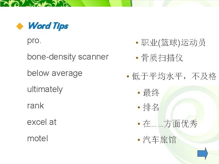 7. keen adj. ② very strong Collocation keen north wind brains competition interest 刺骨的北风 头脑敏锐 激烈的竞争 兴趣浓厚