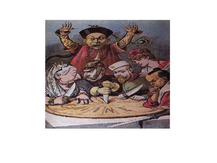 French political cartoon from the late 1890 s: nations “Carving China into spheres of Influence. A pie represents "Chine" (French for China): It is being divided between caricatures of Queen Victoria of Britain, William II of Germany (who is squabbling with Queen Victoria over a borderland piece, while he thrusts a knife into the pie to signify aggressive German intentions). Nicholas II of Russia, is eyeing a particular piece, the French Marianne who seems not to care. The Meiji Emperor of Japan, carefully contemplating which pieces to take. Chinese official throws up his hands to try and stop them, but is powerless.