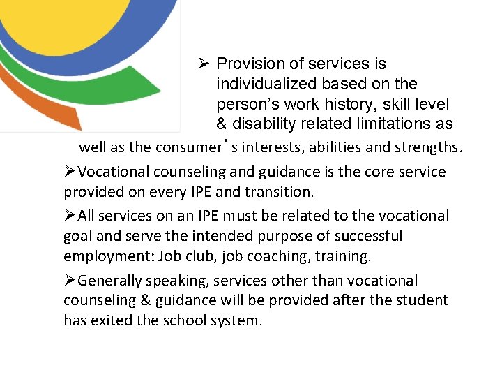 Ø Provision of services is individualized based on the person’s work history, skill level & disability related limitations as well as the consumer’s interests, abilities and strengths. ØVocational counseling and guidance is the core service provided on every IPE and transition. ØAll services on an IPE must be related to the vocational goal and serve the intended purpose of successful employment: Job club, job coaching, training. ØGenerally speaking, services other than vocational counseling & guidance will be provided after the student has exited the school system.