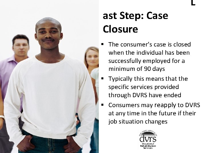 ast Step: Case Closure L § The consumer’s case is closed when the individual has been successfully employed for a minimum of 90 days § Typically this means that the specific services provided through DVRS have ended § Consumers may reapply to DVRS at any time in the future if their job situation changes