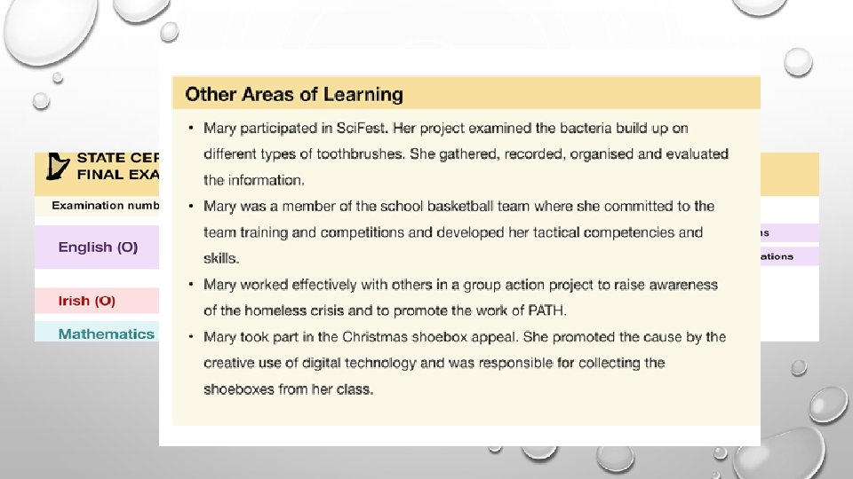 Final Exam • Written Exam (as before) • 90% • Common Level except Mathematics, English & Irish • One 2 -hour Exam Paper in all subjects except Art.