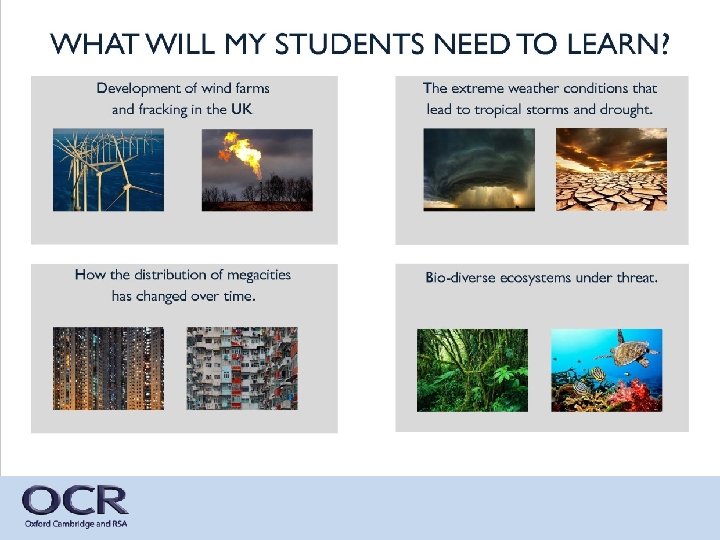 Results - robust and reliable assessment - Our papers are straightforward papers with clear, unequivocal and explicit questions and directions, in plain English. - Taken extensive measures to ensure accuracy of assessment: examiners are teachers or ex-teachers (6 years’ + experience of working for us) - Positive marking: OCR’s has ensured its assessors give credit for what a candidate has achieved & not penalise for answers that are lacking. - Clip by clip, anonymous marking – different questions are marked by different examiners, trained within specific specialisms. - Student answer all questions, so there is no confusion - Inserted answer lines to inform students of the length of answer. OCR has given a guide of answer length with answer lines included in the question papers. This helps ensure the stronger students (old higher tier) do not over-respond to the low-tariff questions and also to give the weaker learners (old foundation tier) direction to include more detail on the higher tariff questions; making our papers accessible for all learners now that Geography is an untiered exam. - More marks than minutes: moving away from the normal mark a minute and allowing students more time to think for about the question(= Higher attainment) - Confidence-building questions: exam papers begin with the simpler confidence building questions targeting the lower grades at each tier, before moving on steadily through the paper to questions targeting the upper grades at each tier. - No ambiguous wording: We are placing additional focus on our scrutiny of the language, to ensure that no language is used that could hinder candidates’ understanding of the questions (set by language professionals) - Double Commands on higher questions – for grade differentiation - Resources in a separate booklet so exam paper has fewer pages and less daunting to the candidate. Also cheaper to print - Marks for questions in bold so clearly seen by the candidate and can be used as a guide for answering. - Simple numbering of resource figures – 1, 2, 3, 4, 5 rather than 1 a, 1 b, 1 c, 1 d, 1 e. - NO confusing front cover guidance – “answer two questions from questions 2, 3 and 4 and “try to answer every question”. - Students are asked to answer ALL questions, so no confusion. avoids some candidates answering them all by mistake and spending less time on those where marks can be gained - Resources figures shown in bold within questions so easily identified by the candidate. - Clear guidance on the use of additional pages at the end of the answer booklet to avoid errors, ie, numbering answers. - Exciting content studied in topics and brought to life by engaging enquiry questions - Candidate to answer all questions rather than some which Getting results. Student progress. Departmental targets. Smooth Transition KS 3 – KS 4 and KS 4 –KS 5 - Free online transition guides and checkpoint tasks for KS 3 – 4 which include checkpoint tasks designed to test readiness for progression and can identify skills gaps. Useful for stronger learners in year 8 or those who need further support in year 9/10. - GCSE Models are mirrored in assessment style and structure at A Level - Look too at Exam. Creator to help with revision, target-setting and tracking progress - Active. Results: results, data, documents and reports – You can view all your centre results on OCR’s secure site: Interchange. Where