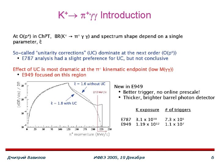 K+ + ` n 3 d candidate event “E 949 A” found E 787 A E 787 C E 949 A 0. 006 n 0. 02 0. 07 Updated branching Br(K+ + ` ) = (1. 5 +1. 3 -0. 9 ) x 10 -10 n SM predicted branching Br(K+ + ` ) = (0. 78± 0. 12 ) x 10 -10 n PNN 2 analysis is in progress Goal is to reach S/N 1 at comparable to PNN 1 sensitivity 2 x Acc and 5 x Rej improvements needed Дмитрий Вавилов ИФВЭ 2005, 19 Декабря 5