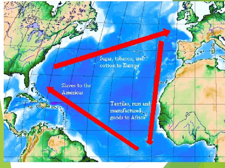 Triangular Trade Europe/mother country Americas Trade moves in a triangular pattern from Europe to Africa to the Americas and back to Europe. Africa
