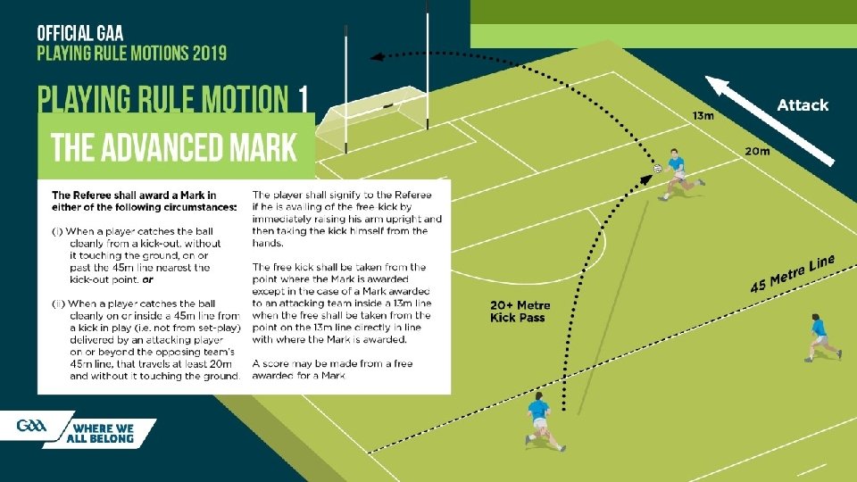 Advance Mark Ball must be kicked from on or outside 45 m line Must land on or inside 45 m line attacking side Must have travelled 20 m Mark called by putting hand in the air, any player can claim a mark 15 sec to take the kick