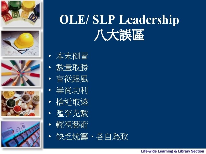 Understanding OLE and SLP • OLE & SLP 源起篇 • OLE & SLP 解碼 – – Positioning in the NSS Curriculum Time arrangement of OLE Why OLE? Seven Guiding Principles & school-based approaches – Student Learning Profile – Web. SAMs as an example tool • OLE Leadership in schools