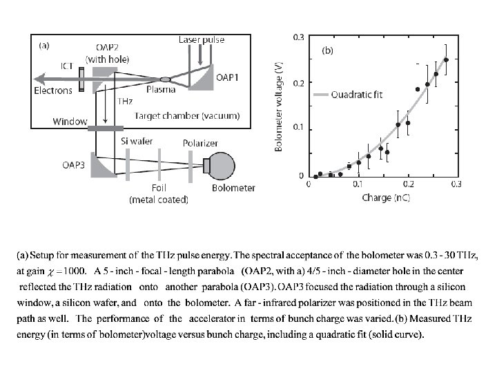(a) Setup for measurement of the THz pulse energy. The spectral acceptance of the bolometer was 0. 3− 3 THz, at gain χ = 1000. A thin foil reflected the THz radiation through the Rexolite window, through pieces of poly-Styrene and Teflon, and onto the bolometer. (b) Measured THz energy (∼bolometer voltage) versus bunch charge. The performance of the accelerator in terms of bunch charge was varied during the data collection. The agreement between the data and a quadratic fit demonstrates the coherent nature of the radiation.
