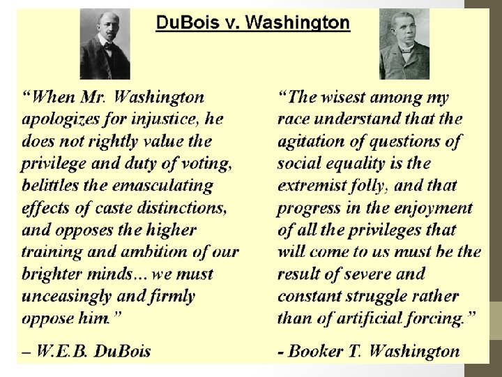 • Booker T. Washington (1856 -1915) - educator, author, political activist, and orator; promoted the idea that the best approach for African-Americans or Blacks to gain a foothold in white society was through hard work, education, and economic accomplishments, before gaining full civil rights (the concept of accommodationism). • This idea of cooperation and “going slow” was explained in the “Atlanta Compromise Speech” at the International Cotton Exposition of 1895; criticized by W. E. B. Du. Bois and ultimately proved wrong by the 1906 Atlanta Race Riot.