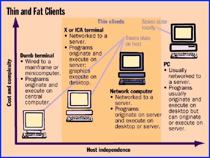Thin Client Systems • … an approach to computer networking wherein the processing horsepower to run applications and data storage are placed on a central server and the user interface is placed on a desktop computer that accesses the server to execute applications. • The idea of thin-client systems has been around since the time of the mainframe computer. Improvements in affordable server power has increased thin-client feasibility.
