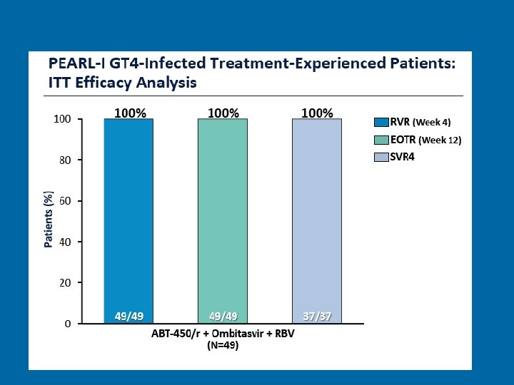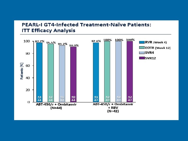 PEARL 1 INTERFERON-FREE REGIMENS OF ABT-450/R + ABT-267 WITH OR WITHOUT RIBAVIRIN In 135 Ch HCV GENOTYPE 4 Patients Treatment-naive and Peginterferon/RBVexperienced patients with chronic HCV GT 4 infection were enrolled. Treatment-naive patients received ABT-450/r (150/100 mg QD) + ABT-267 (25 mg QD) ± weight-based RBV for 12 weeks. Experienced patients received the RBV-containing regimen for 12 weeks. Hezode EASL 2014 Ab 58