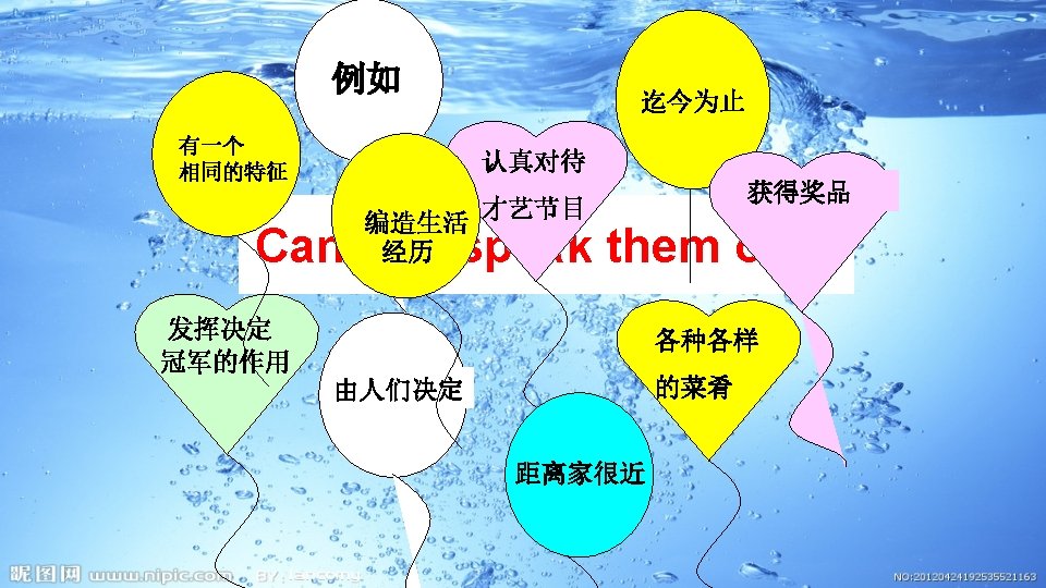 Remember the phases by matching itself with its meaning. 1. be close to home e 2. so far d 3. all kinds of dishes h a有一个相同的特征 b例如 c认真对待才艺节目 4. be up to the people j d迄今为止 5. play a role in deciding the winner f e距离家很近 6. make up lives g f 发挥决定冠军的作用 7. for example b 8. take talent shows seriously c g编造生活经历 9. have one thing in common a 10. get a good prize i h各种各样的菜肴 i获得奖品 j由人们决定