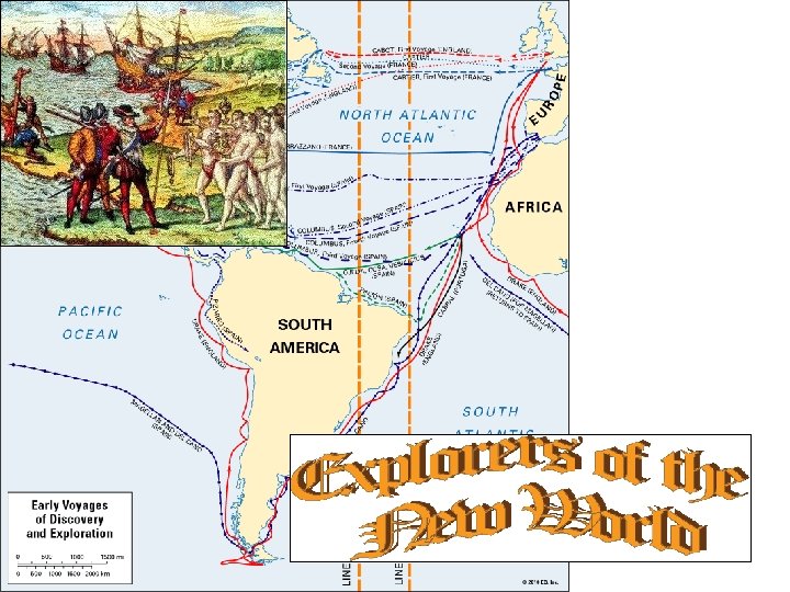 Exploration Timeline • 1 st century AD – Chinese • 1497 – John Cabot invent the first compass discovers Newfoundland • 120 AD – first flat map of world • 1502 – Amerigo • 982 – Eric the Red discovers Vespucci returns Greenland from exploration of • 1002 – Leif Ericson discovers New World; North American continents • 1271 – 1295 Marco Polo goes named after him by to China German mapmaker • 1453 – Turkish Empire cuts off land route for spices from Asia • 1513 – Balboa discovers eastern to Europe shore of Pacific • 1492 – Columbus sails to New Ocean World