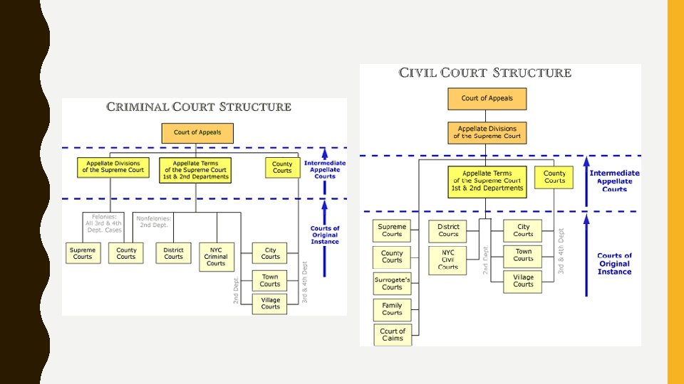JUDICIAL New York State Unified Court System -Consists of the superior courts, local courts, appellate courts. -Criminal trials are in county courts (or NYC) --Supreme court highest criminal court --Court of Appeals highest court in state --Specialized courts such as family courts